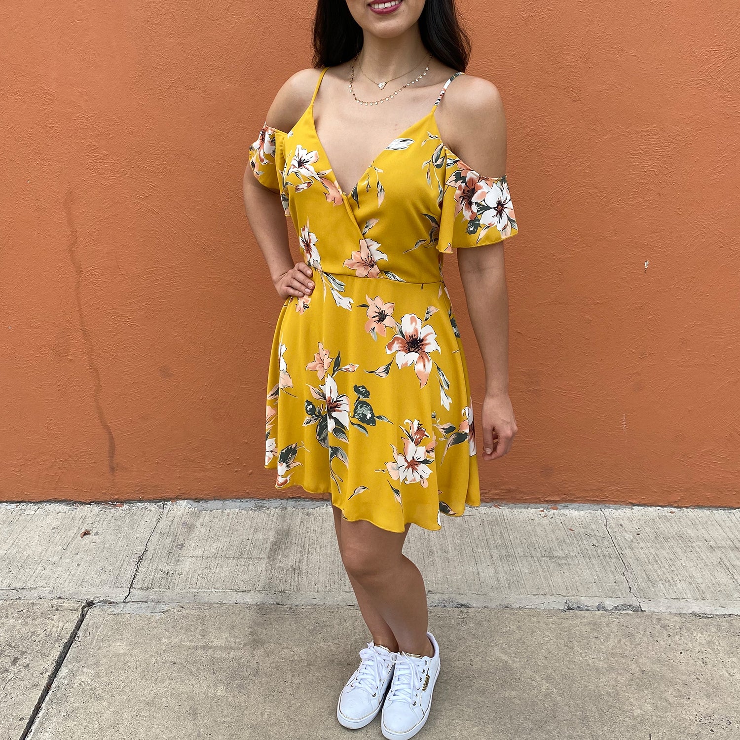 Vestido corto amarillo estampado floral cold-shoulder